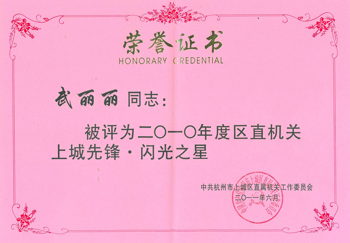 祝賀我公司員工武麗麗同志,被中共杭州市上城區(qū)直屬機(jī)關(guān)工作委員會(huì)評(píng)為二〇一〇年度區(qū)直機(jī)關(guān)上城先鋒·閃光之星