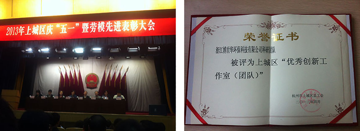 2013年4月26日,在2013年上城區慶“五一”暨勞模先進表彰大會上,浙江博世華環??萍加邢薰究蒲袌F隊,經申報評議,被上城區總工會授予“上城區優秀創新團隊”榮譽稱號。