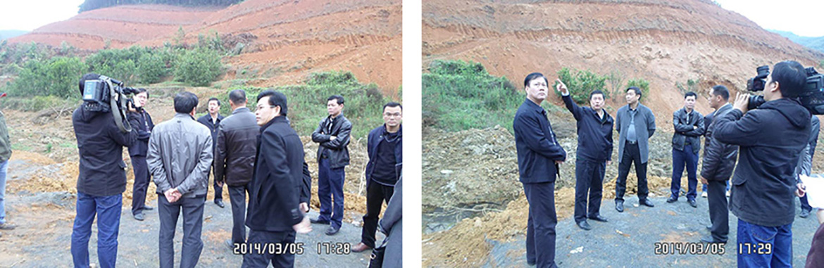 2014年3月5日下午,肇慶市副市長范汝雄、封開縣縣長黃學武一行帶領有關部門領導來到封開縣生活垃圾衛生填埋場建設工程施工現場視察工程情況。范汝雄副市長對施工現場進行了查看,做出了一系列工作指導;同時指出,在確保施工進度的情況下,要把質量安全放在首位;此刻正處雨季,一定要做好填埋場庫區的防洪排水工作,防止庫區邊坡因雨水的沖刷而發生地質災害。