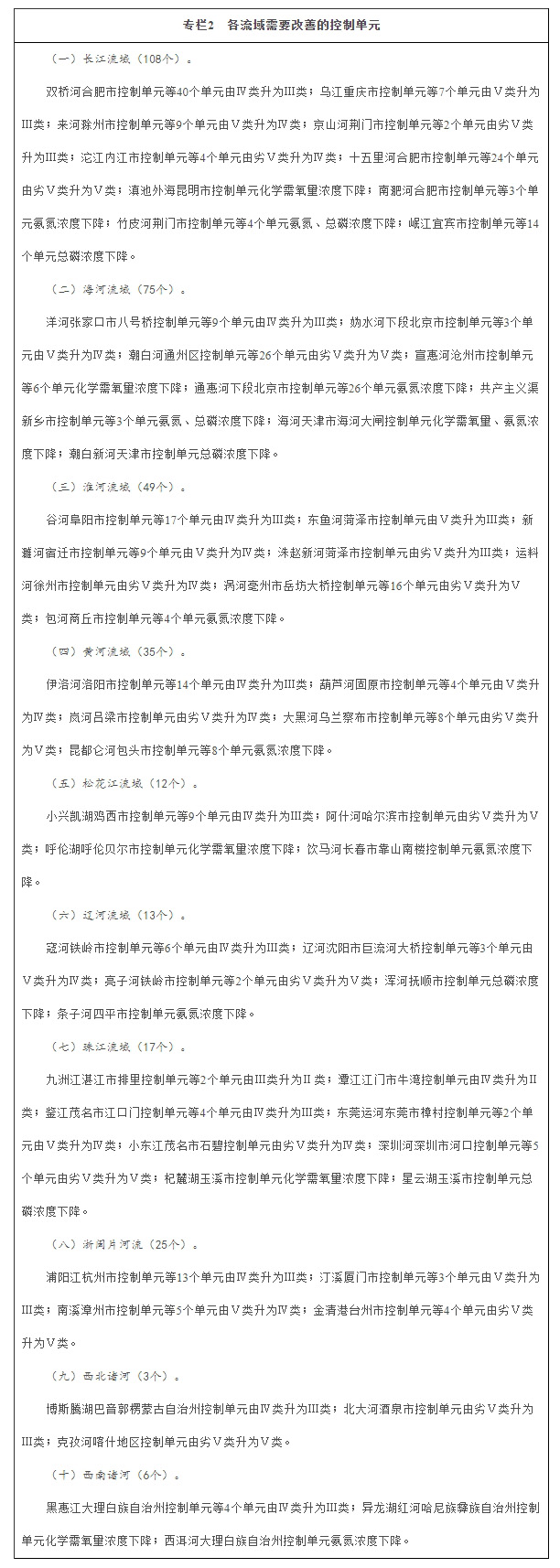實施以控制單元為基礎的水環境質量目標管理。依據主體功能區規劃和行政區劃,劃定陸域控制單元,建立流域、水生態控制區、水環境控制單元三級分區體系。實施以控制單元為空間基礎、以斷面水質為管理目標、以排污許可制為核心的流域水環境質量目標管理。優化控制單元水質斷面監測網絡,建立控制單元產排污與斷面水質響應反饋機制,明確劃分控制單元水環境質量責任,從嚴控制污染物排放量。全面推行“河長制”。在黃河、淮河等流域進行試點,分期分批科學確定生態流量(水位),作為流域水量調度的重要參考。深入實施《水污染防治行動計劃》,落實控制單元治污責任,完成目標任務。固定污染源排放為主的控制單元,要確定區域、流域重點水污染物和主要超標污染物排放控制目標,實施基于改善水質要求的排污許可,將治污任務逐一落實到控制單元內的各排污單位(含污水處理廠、設有排放口的規模化畜禽養殖單位)。面源(分散源)污染為主或嚴重缺水的控制單元,要采用政策激勵、加強監管以及確保生態基流等措施改善水生態環境。自2017年起,各省份要定期向社會公開控制單元水環境質量目標管理情況。