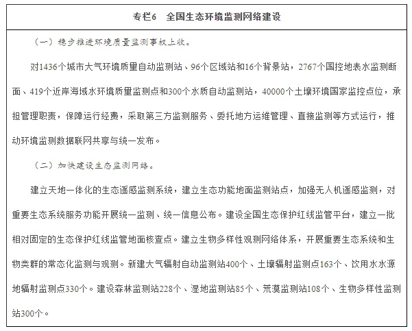 加強生態環境監測網絡建設。統一規劃、優化環境質量監測點位,建設涵蓋大氣、水、土壤、噪聲、輻射等要素,布局合理、功能完善的全國環境質量監測網絡,實現生態環境監測信息集成共享。大氣、地表水環境質量監測點位總體覆蓋80%左右的區縣,人口密集的區縣實現全覆蓋,土壤環境質量監測點位實現全覆蓋。提高大氣環境質量預報和污染預警水平,強化污染源追蹤與解析,地級及以上城市開展大氣環境質量預報。建設國家水質監測預警平臺。加強飲用水水源和土壤中持久性、生物富集性以及對人體健康危害大的污染物監測。加強重點流域城鎮集中式飲用水水源水質、水體放射性監測和預警。建立天地一體化的生態遙感監測系統,實現環境衛星組網運行,加強無人機遙感監測和地面生態監測。構建生物多樣性觀測網絡。